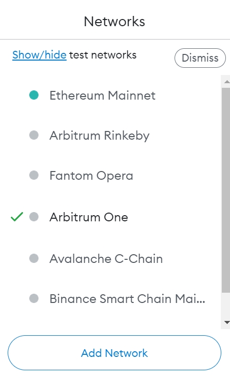 Arbitrum is an EVM-compatible chain, meaning it can easily work with MetaMask, as well as most browser-based wallets. Click on the network drop-down menu, and select "Add Network" from the bottom. Add in the following details: