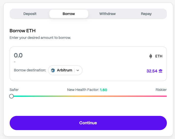 Set the desired borrow amount based on your available collateral balance, and continue to confirm the transaction. Note that the more you elect to borrow, the greater the impact on your overall [Health Factor](#health-factor) (more on this below).