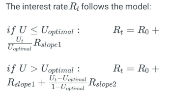 Liquidity risk materializes when utilization is high, and this becomes more problematic as U gets closer to 100%. To tailor the model to this constraint, the interest rate curve is split into two parts around an optimal utilization rate $$U\_{optimal}$$. Before $$U\_{optimal}$$the slope is small, after it begins rising sharply.
