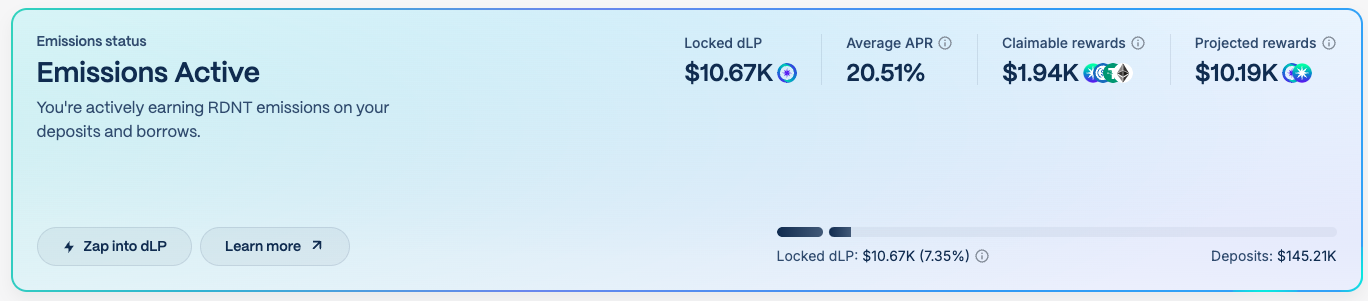 If you fall out of eligibility, an "emissions inactive" notification is visible at the top of each page and indicates the amount of dLP required to regain eligibility. Click "zap into dLP" and follow the prompts to resume receiving $RDNT emissions.