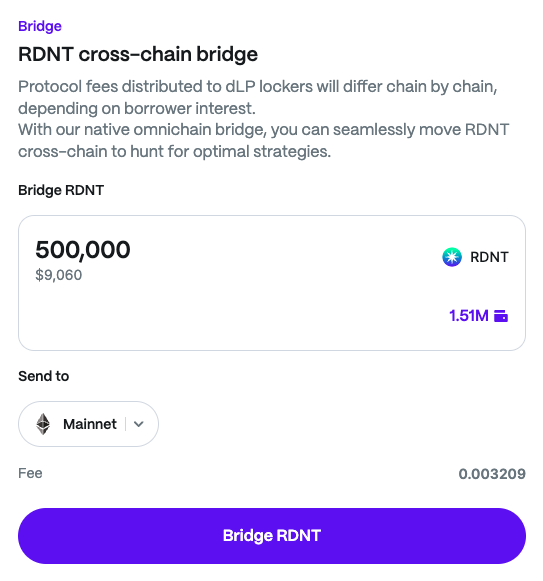 Under "RDNT cross-chain bridge," input the amount of RDNT you would like to bridge, select the destination chain you would like your tokens to be sent, and click "bridge RDNT" to confirm the transaction in your wallet.