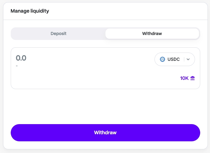 To withdraw, navigate to the Manage Liquidity section and select the "Withdraw" tab.