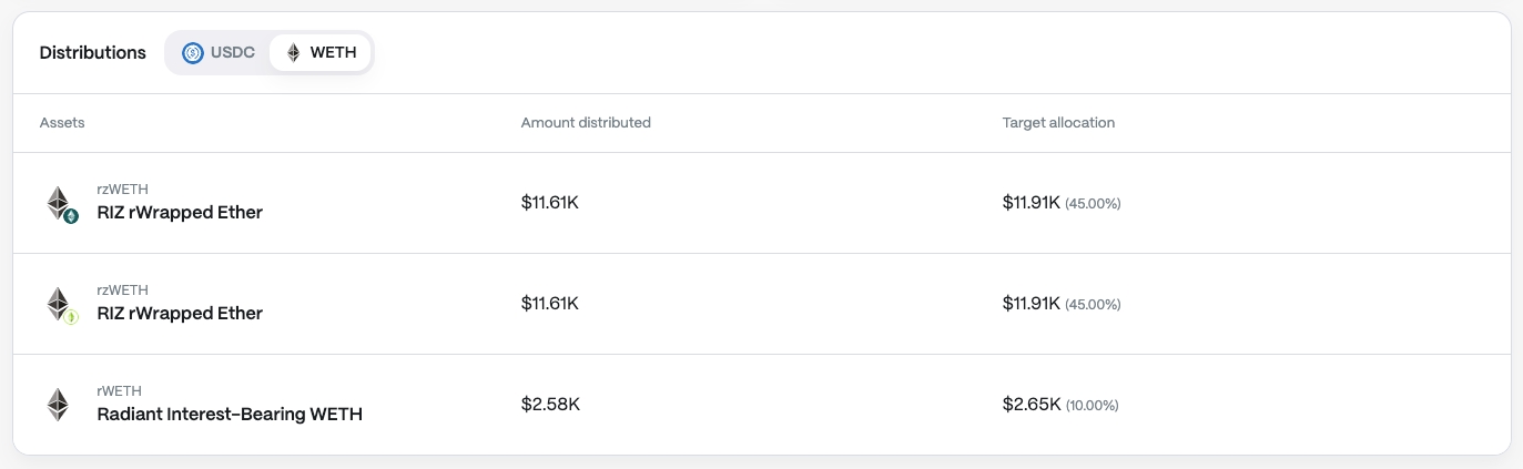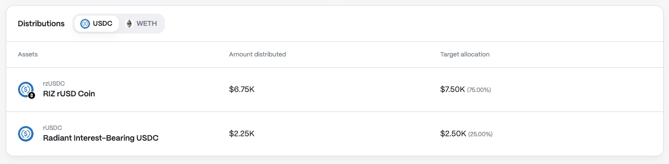 In the "Distributions" section, users can check out how the deposited assets are distributed across different markets. The Radiant DAO manages these calculations off-chain to optimize yield.