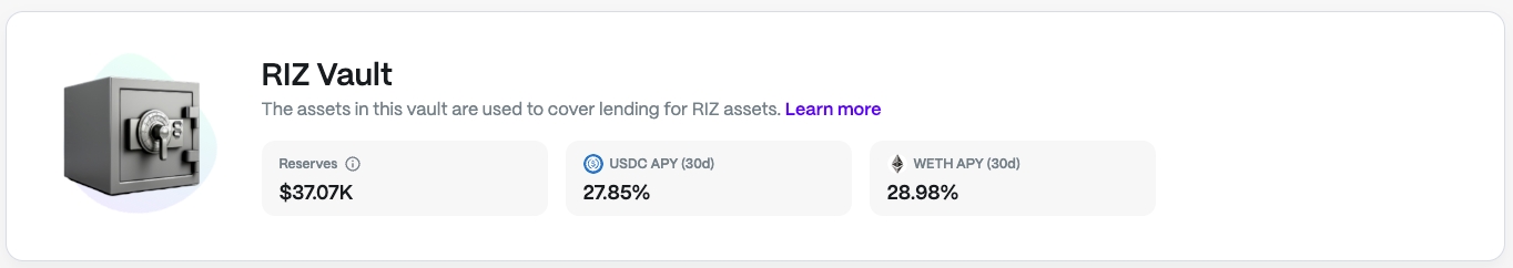 Navigating to the RIZ Vault section allows you to deposit or withdraw liquidity from the available vaults.